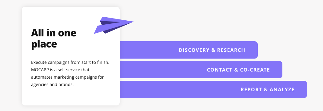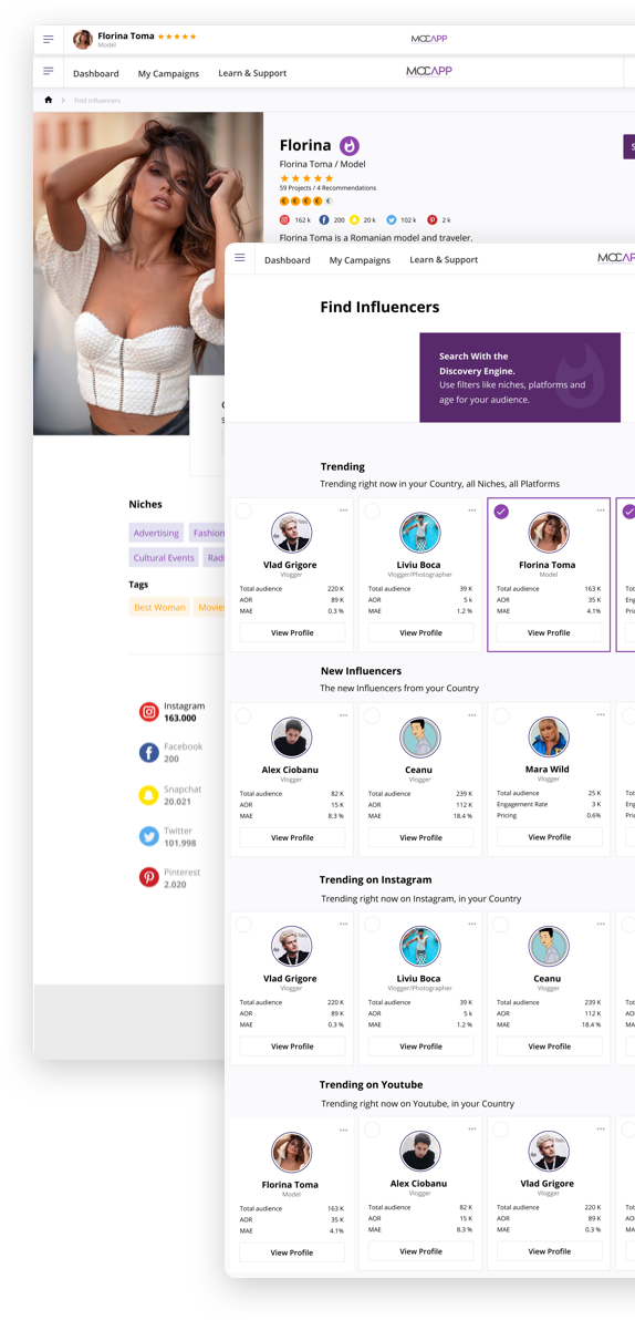 Using our patent-pending algorithm, MOCAPP recommends you a list of relevant Influencers, according to your criteria (budget, niches, platforms, demographics, etc.).